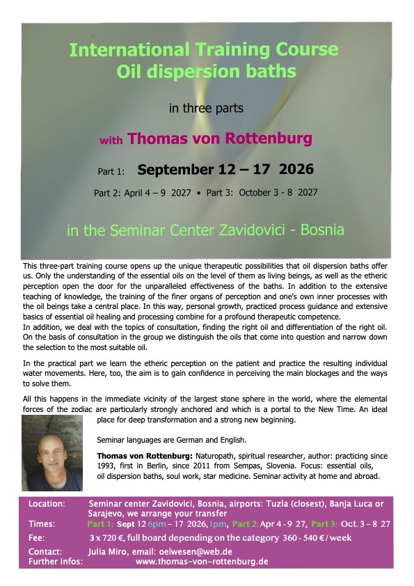 Oil dispersion baths are a highly effective form of therapeutic application. The vortex principle allows the essential oil to be potentized in water, thereby releasing the oil’s innate dynamic. We could therefore look at this method as the crowning of essential oil application.