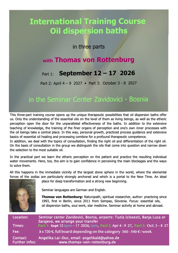 Oil dispersion baths are a highly effective form of therapeutic application. The vortex principle allows the essential oil to be potentized in water, thereby releasing the oil’s innate dynamic. We could therefore look at this method as the crowning of essential oil application.