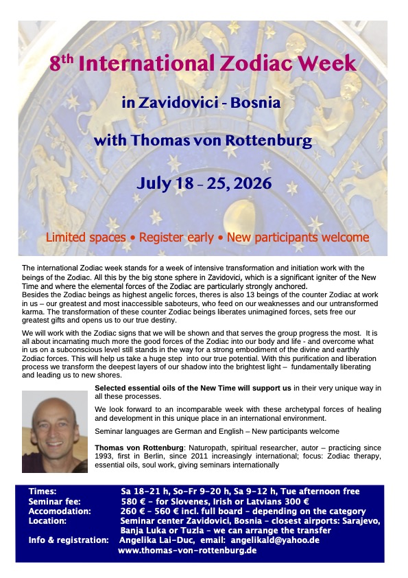 Here we are presented with the undreamt-of opportunity to transfer the strengthening forces of the Zodiac into our own body. If we are ready for it and can open up enough, these divine forces bring about life changing transformations in unprecedented ways.